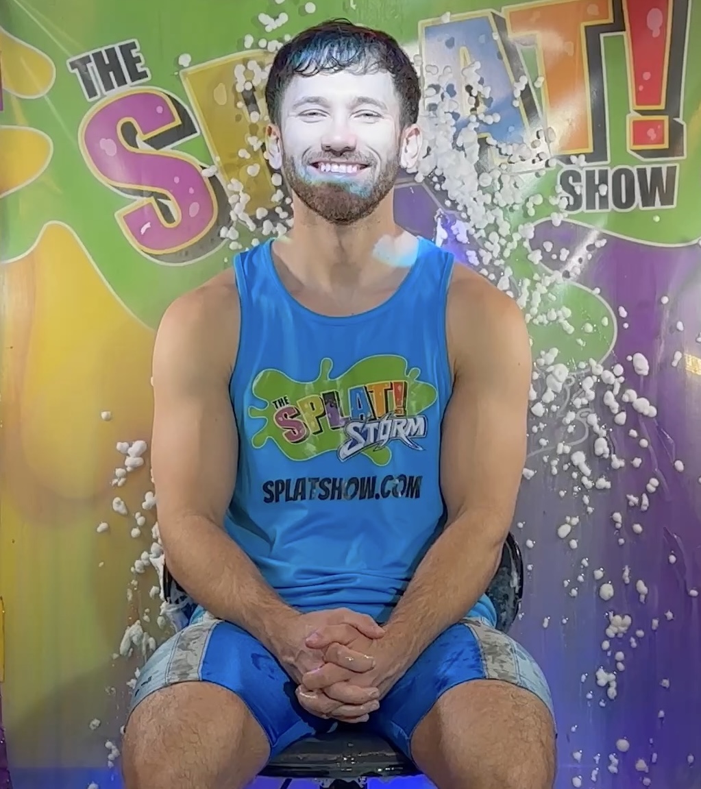 Splat! Storm vest blue, first featured during s24 Splat! Storms. Has Splat! Logo branding and SplatShow.com text.